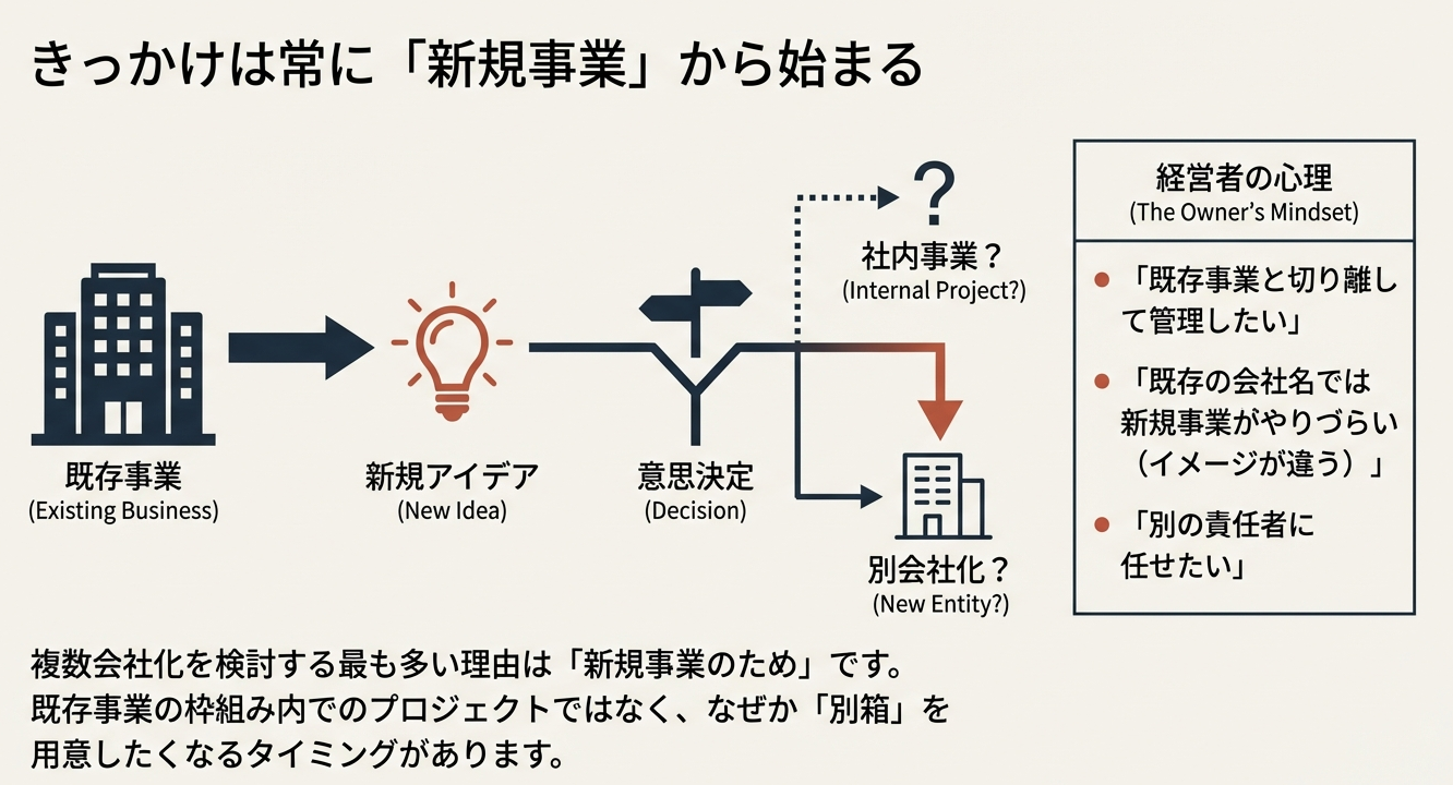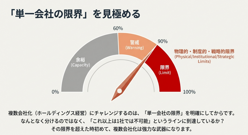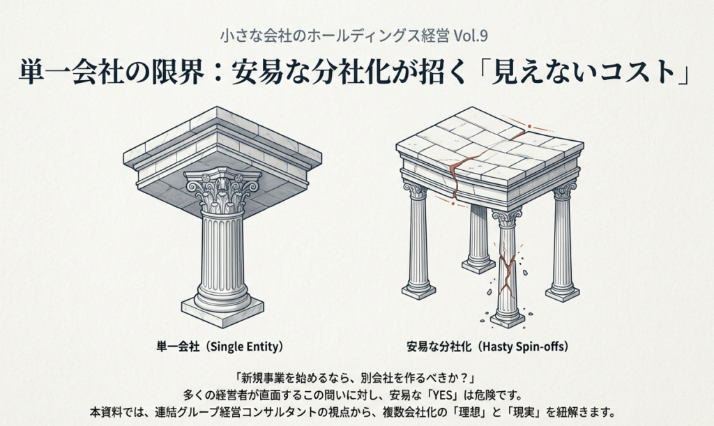 しかし、事業の多角化が進むと、既存のルールや文化が新しい芽を摘んでしまう「単一会社の限界」が必ず訪れます。経営者は、まず「なぜ今の会社組織のままではいけないのか」を論理的に突き詰めなければなりません。