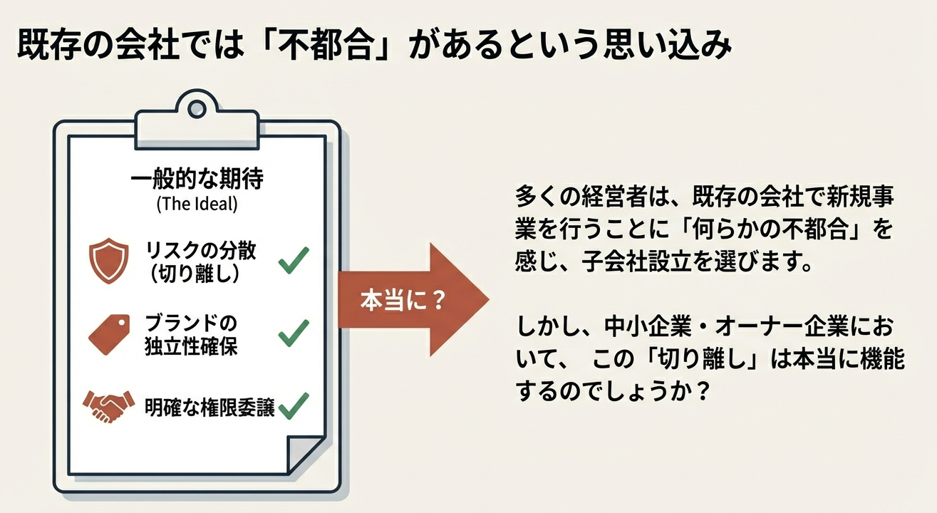 経営者が新規事業を立ち上げる際、あえて「子会社」という形を選択する裏には、既存事業の枠組みがもたらす「不都合」を排除したいという切実な動機があります。