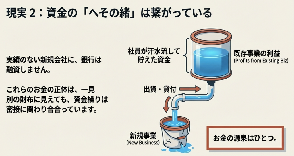 新規事業を別会社化したとしても、その血管には親会社からの「資金」が流れています。この資金移動が、組織心理に決定的な亀裂を生む最大要因となります。