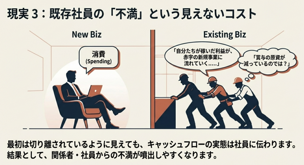 投じられる資金の源泉を辿れば、それは「既存事業の社員が汗を流して稼ぎ、蓄積してきた利益」に行き着きます。この事実を軽視する経営判断は、既存事業側の社員に強烈な「不公平感」を植え付けます。