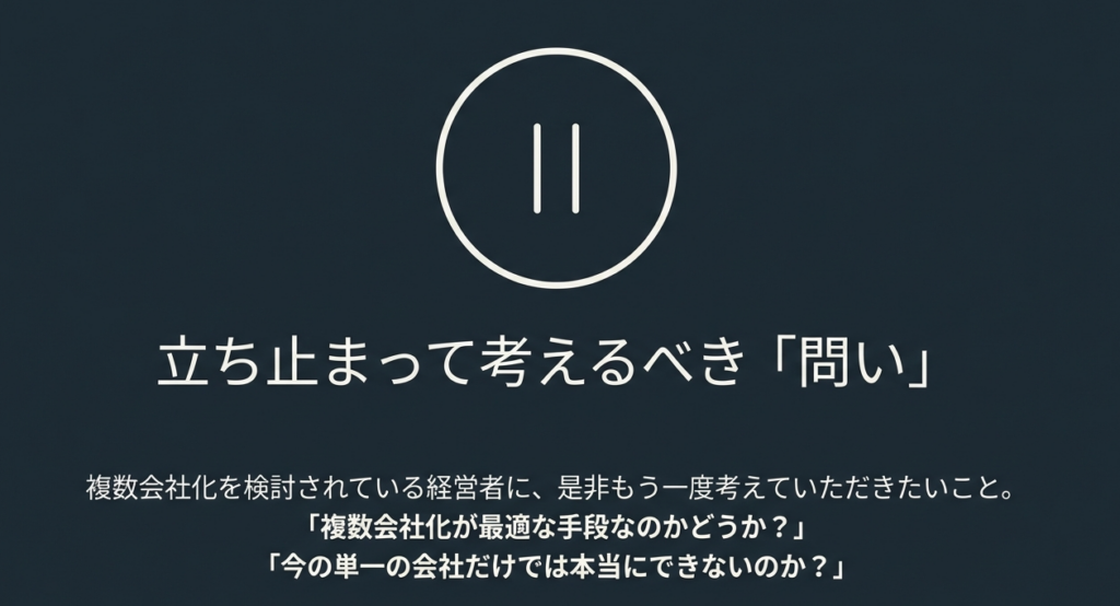 会社を増やすことは、経営者の悩みと事務作業を倍増させることです。それらの負担を補って余りある未来を、自分と社員に示せる確信があるか。