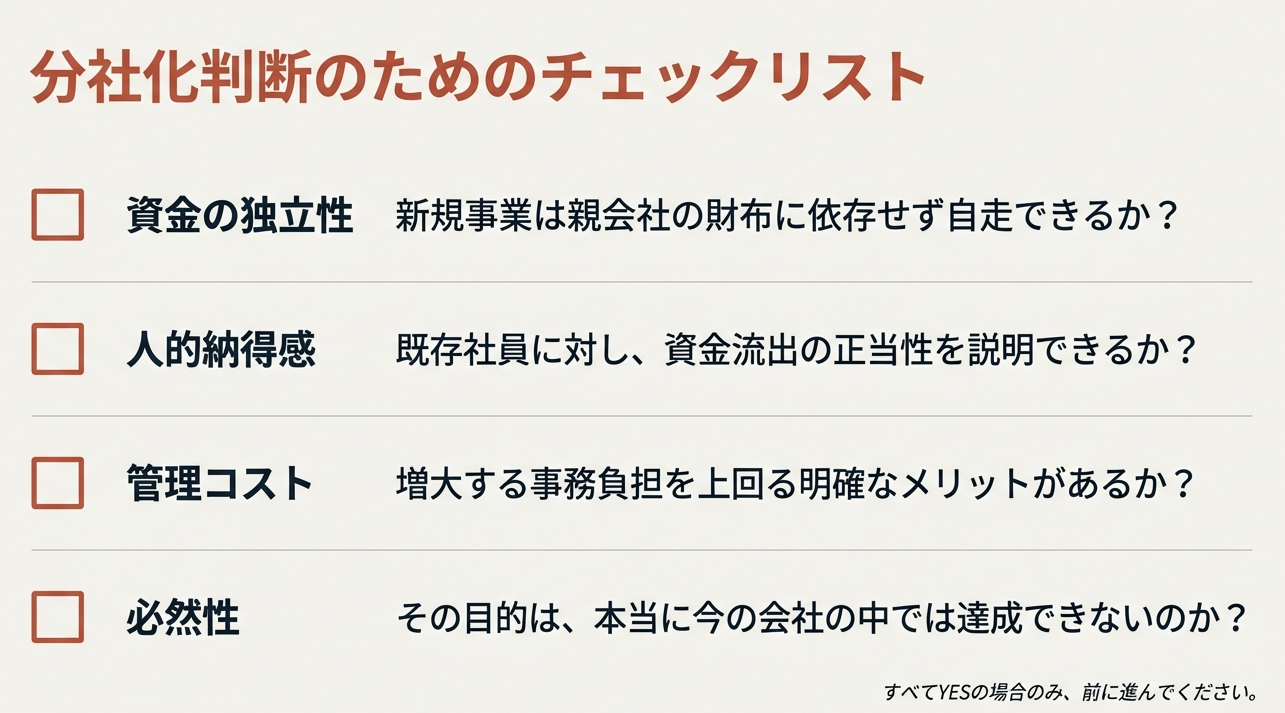今の組織の中で工夫して解決できる余地が1%でもあるならば、安易に会社を分けるべきではありません。別法人化は、あらゆる社内調整を尽くした末の「最終手段」であるべきです。