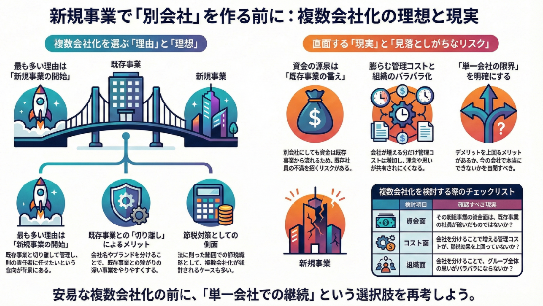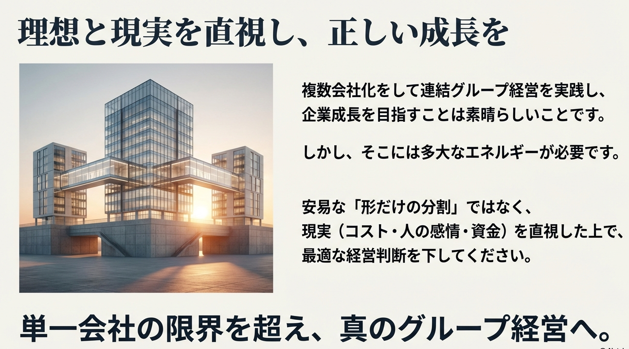複数会社化は、適切に運用すれば飛躍の起爆剤となりますが、一歩間違えれば組織をバラバラに解体する劇薬となります。