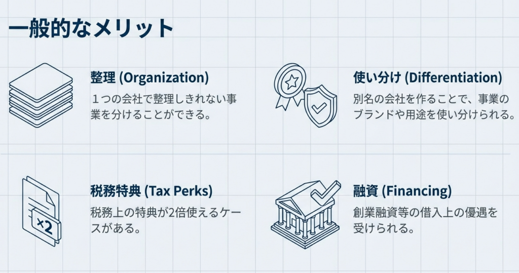 1つの箱(会社)に複数の事業が混ざっていると、本当の数字が見えにくくなります。会社を分けることで、事業ごとの収益性と責任の所在が「見える化」されます。