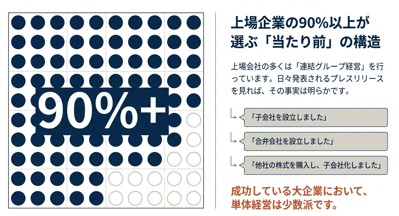 事実として、国内上場企業の90%以上が連結グループ経営を採用しています。彼らが子会社設立やM&Aを繰り返すのは、それが持続的成長のための「標準的な生存戦略」だからに他なりません。