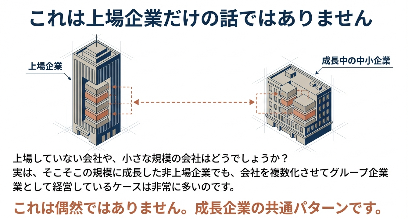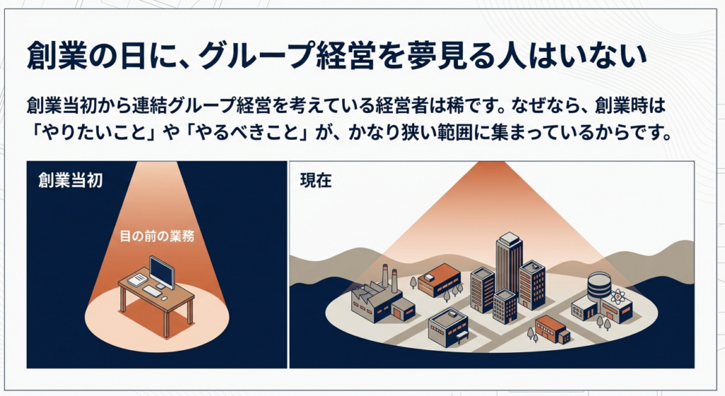 非上場企業や中小規模の組織において、一定の規模に達した際にグループ化が進行するのは決して偶然ではありません。「単一組織での中央集権的コントロール」から、複数会社による「自律分散型の経営」への移行は、組織がスケールするための論理的帰結です。