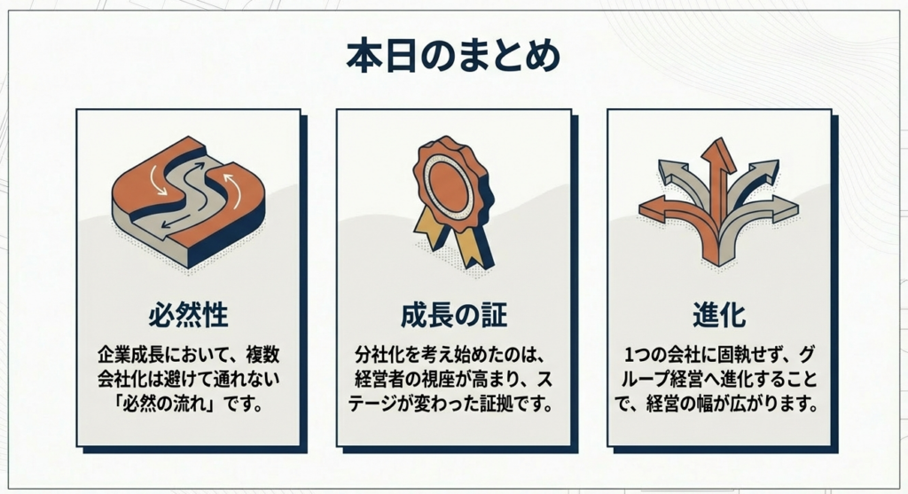 「会社を分けたい」という渇望を抑え込み、既存の器に固執することは、組織の硬直化と停滞を招くだけです。分社化に伴う想定外の事態やマネジメントの複雑化は、企業がさらなるスケールを目指す上で避けて通れない「成長痛」であり、それらを手なずけることこそが経営の真の醍醐味です。